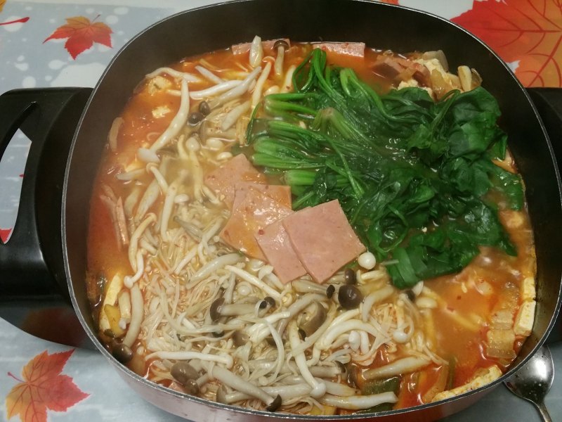 五花肉100g;辣白菜200g;菠菜200g;金针菇100g;蟹味菇100g;白玉菇100g;豆腐300g;方火腿200g;