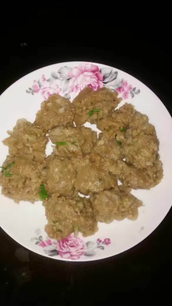 5:准好好一个盘子,盘子上面先涂一层油(蒸好的肉圆才不会粘着盘子)搅拌好的肉弄成一小团。一个个的摆放好。