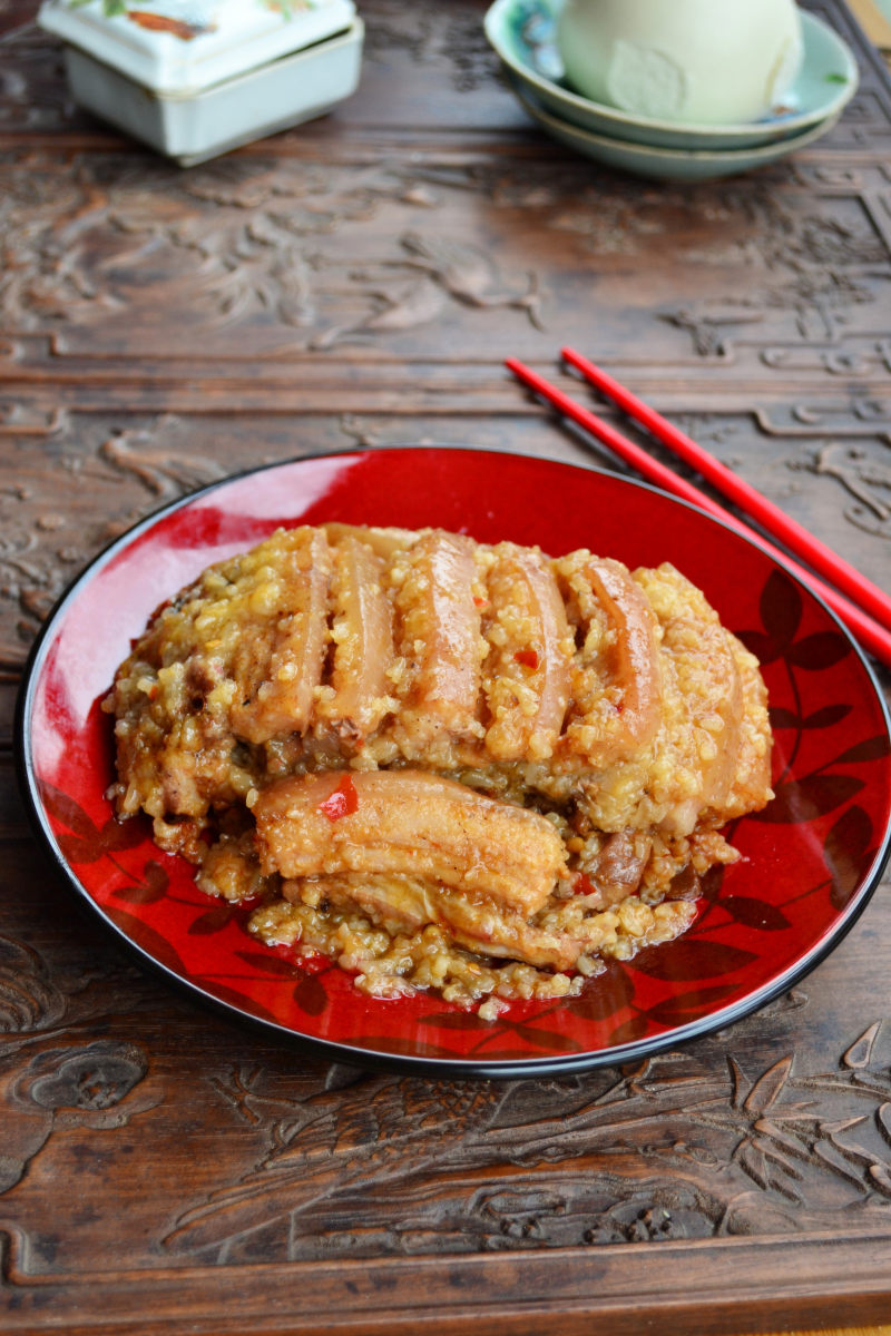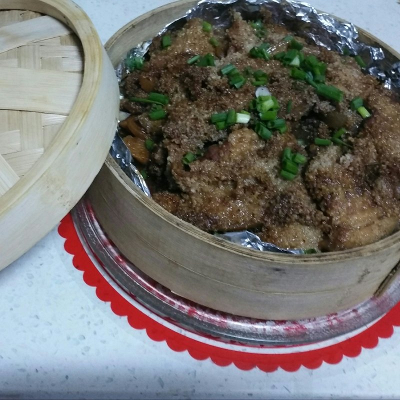 10:蒸肉米粉出锅后,再撒入葱花即可端上桌。