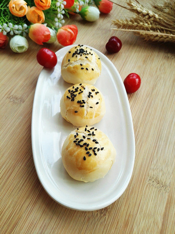 15:烤箱预热上下火180度,豆沙酥的外表涂抹上蛋液(我用的全蛋),然后撒上黑芝麻,预热完成送入烤箱,上下火180度,烤制40分钟,表面金黄即可出炉。