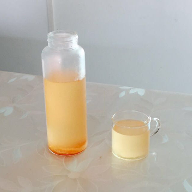 4:椰子水微波炉加热1分钟,然后加入糖搅拌至融化。晾凉至微热,不要烫,不要超过50度。