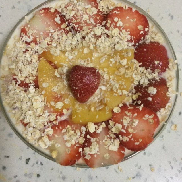 4:将芒果泥倒入酸奶里搅拌均匀,将切好的草莓摆好,中间当上菠萝片,撒上少许燕麦片,个人觉得吃起来口感会更好一点,如果觉得不够甜可以多加一些芒果!也可以加一些蜂蜜