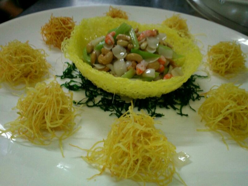 西芹15克;虾仁15克;腰果10克;沙拉酱适量;金丝饼两张;
