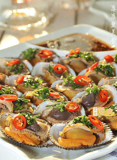 4:4、调好的汁放锅中大火蒸沸,将香菜切碎。鲜红椒切细圈,把煮好的毛蛤去一半皮摆盘,放上香菜碎。