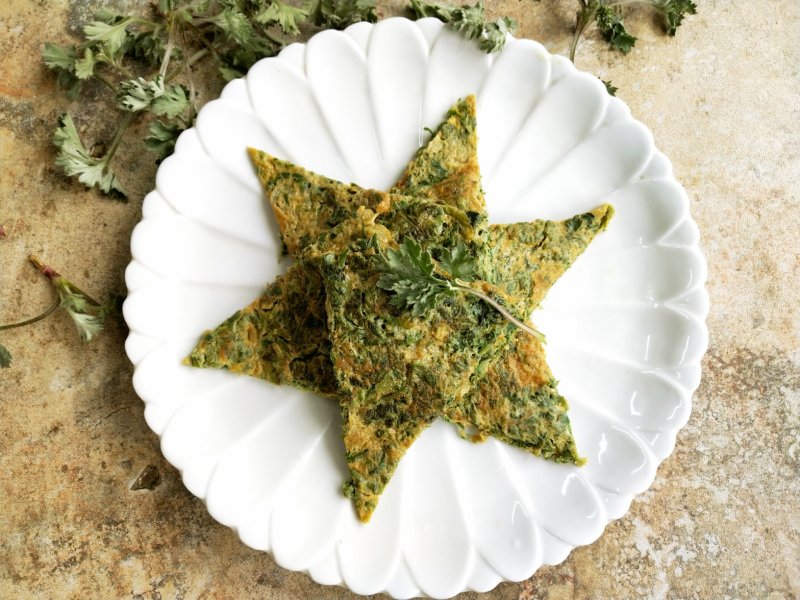 9:取煎饼,切成块,清淡的艾草甘香,非常好吃哦!