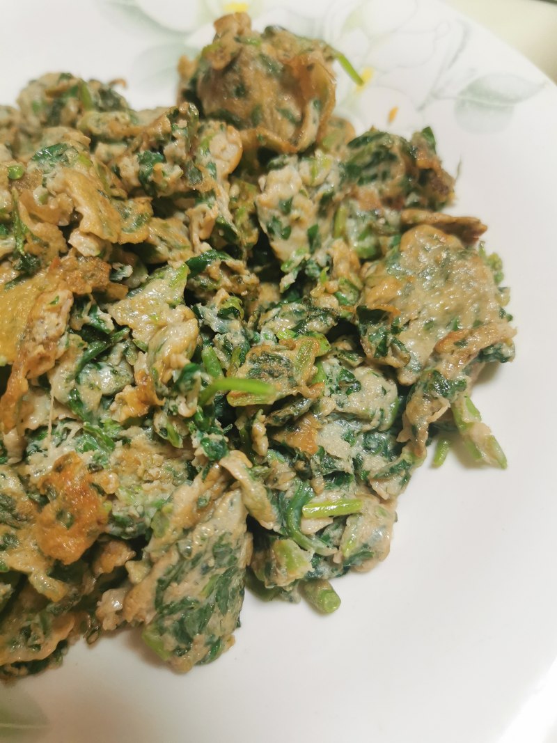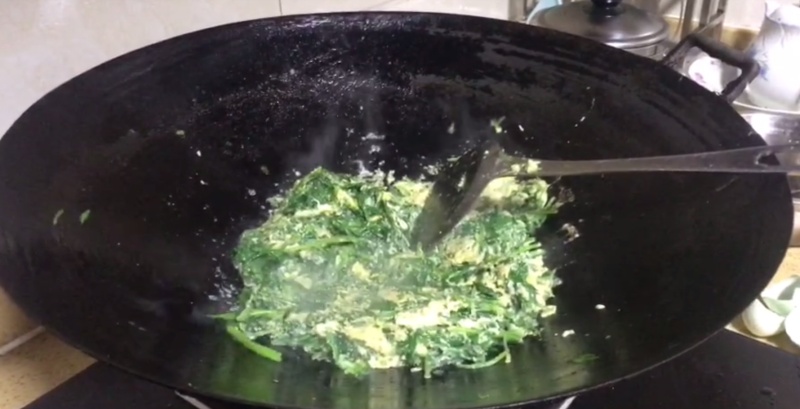 4:待艾叶杀青后,打入鸡蛋,拌匀,然后继续翻炒。