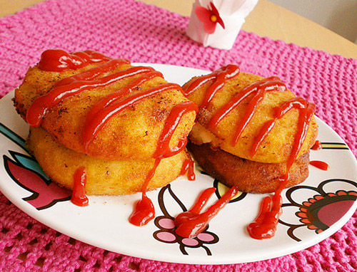 19:平底锅煎好的可乐饼,挤点番茄酱,就是小盆友爱吃的零食啦!