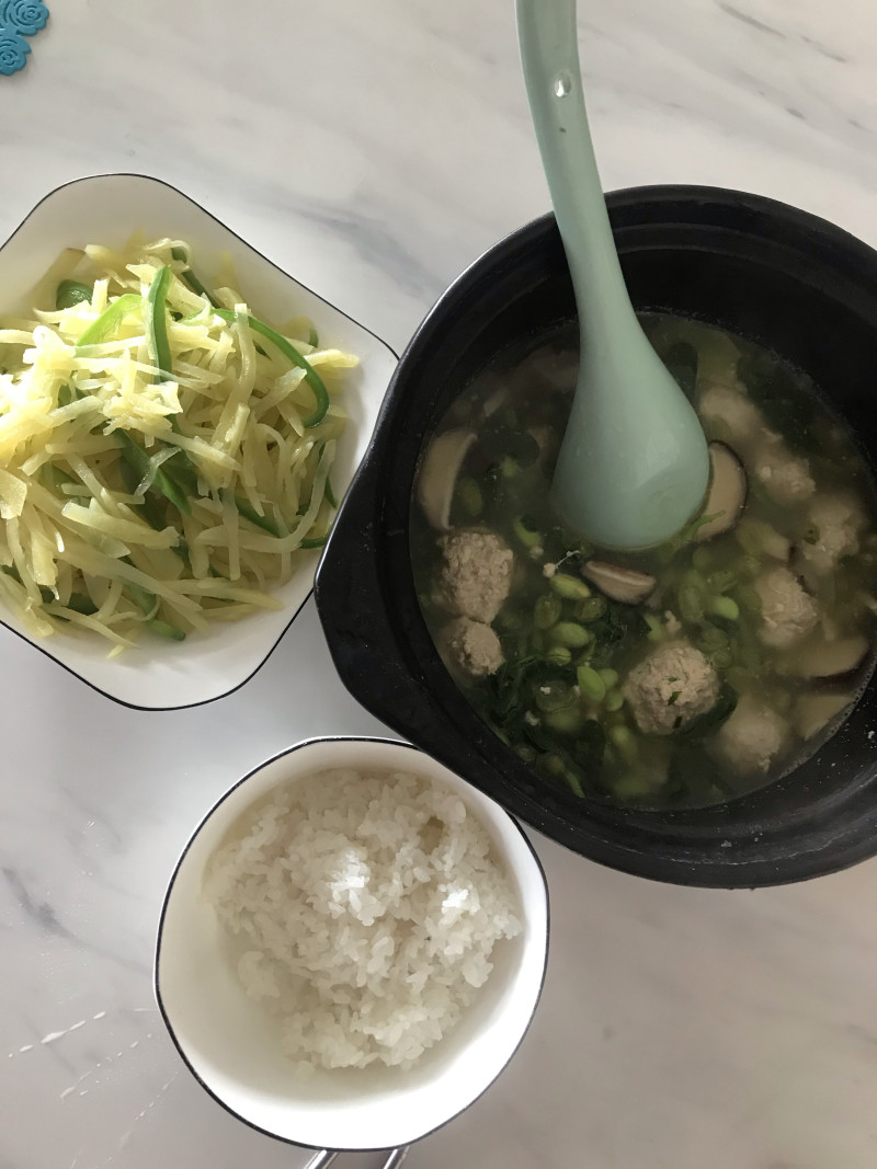 3:油锅放油烧热加入青豆爆炒再加入香菇炒下加入水我是加的昨天多下来的竹笋汤汤太香没舍得倒掉大火烧开后开最小火开始用勺子加入肉圆全部加进去后大火煮熟加盐鸡精调味最后加入青菜烧开后加入点胡椒粉葱花出锅。