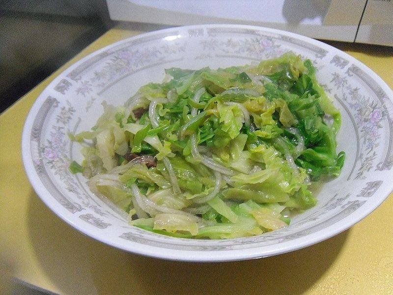 4:放入圆白菜炒匀,放入粉条,加适量清水烧制5分钟,加盐提味。