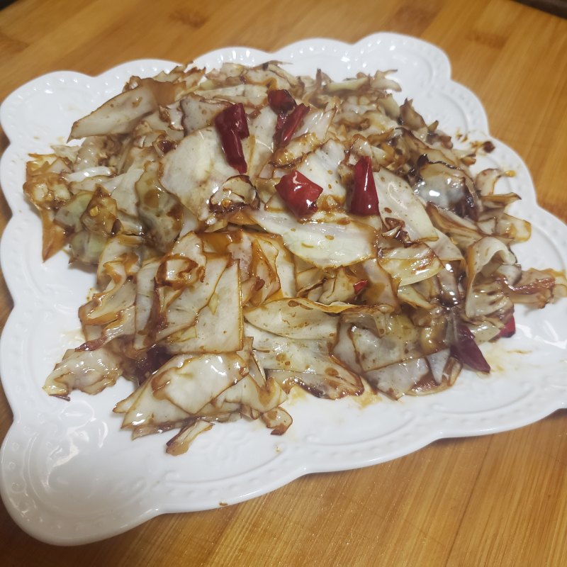 6:下入圆白菜,大火翻炒,加盐、鸡精、糖调味