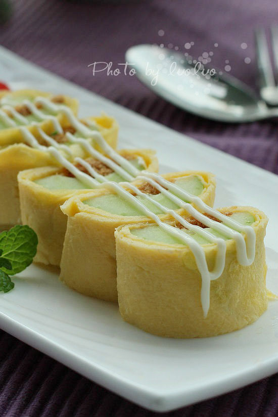 3:放入平底锅中煎成蔬菜蛋饼。黄瓜蛋皮上均匀抹上肉松。卷成卷,切成段。