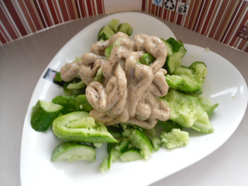 6:辣椒油、海鲜酱油、芝麻油、精盐、味精、白糖、白醋拌匀,浇到黄瓜卷上。撒上蒜末。
