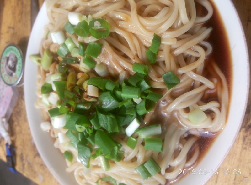 7:最后再洒点葱花和辣萝卜丁,拌匀后,一碗酱香浓郁的热干面就做好了。