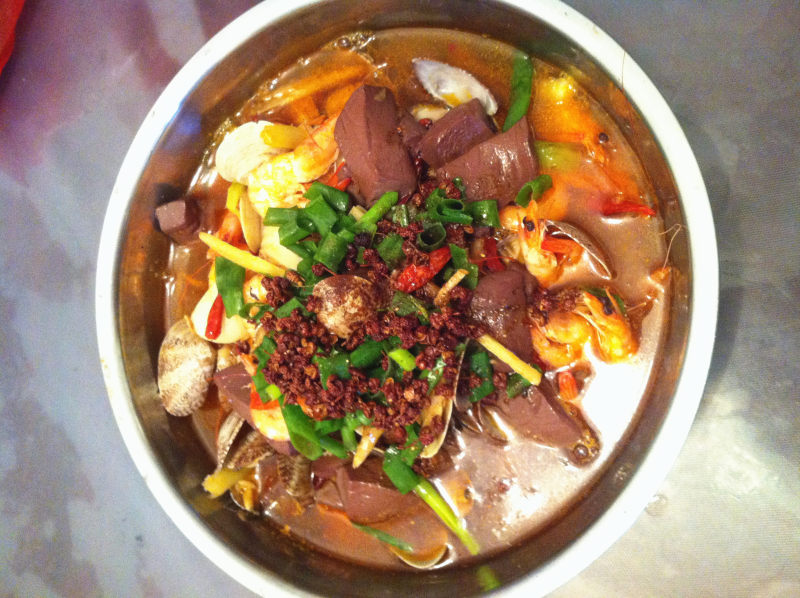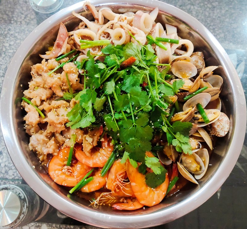 8:三鲜烫好后,平铺在配菜上,洒上葱花,蒜末,干辣椒,花椒,芫荽,白芝麻,热油淋上炝香即可。