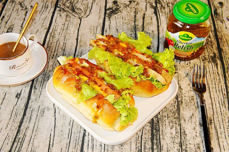 8:最后在汉堡上浇上酸甜青瓜蓉汉堡酱就OK了!早餐可以搭配牛奶或者咖啡,都是不错的选择,好吃滋补不长肉。