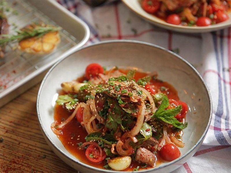 6:把薄荷叶、香菜、洋葱、牛排放在另一碗里备用