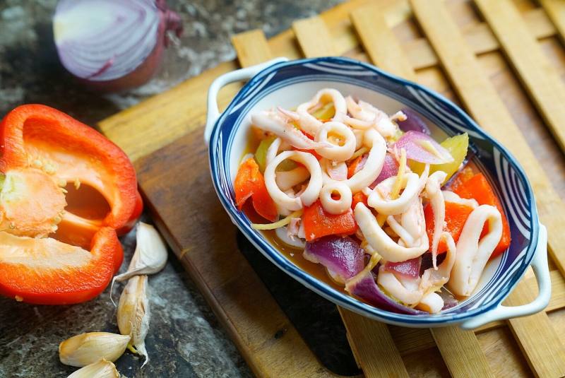4:将切好的鱿鱼和所有辅料一起放入容器抓拌均匀腌渍入味