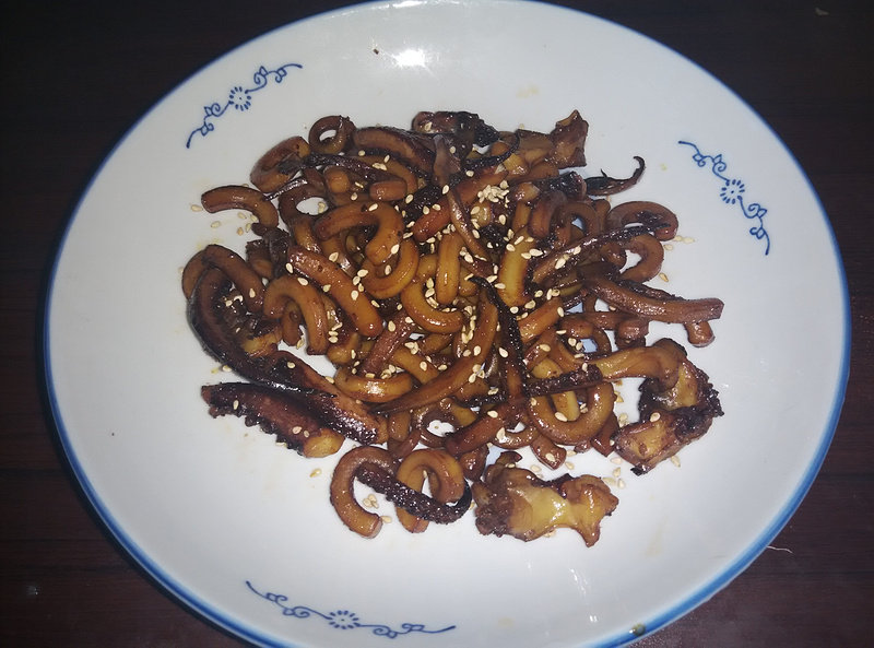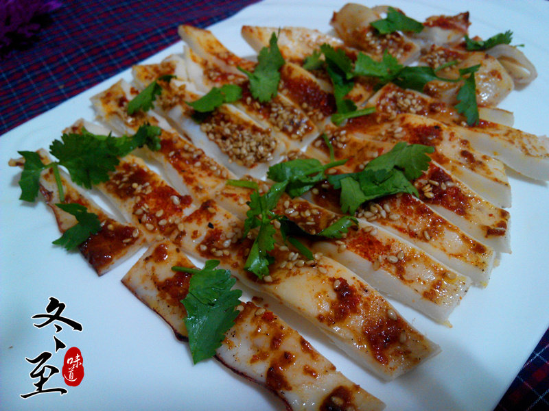 1:鲜鱿鱼处理干净,鲜鱿鱼的爪爪上有软质骨骼,要去除干净,将鱿鱼表皮膜撕下。如果懒可以忽略
