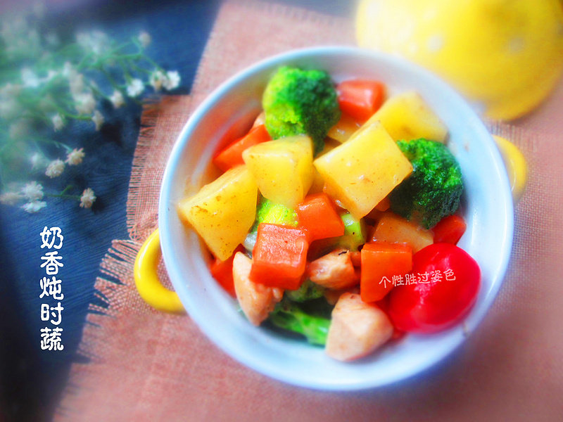 1:准备鸡肉和土豆、胡萝卜、西兰花、圣女果和好侍西趣奶炖小方