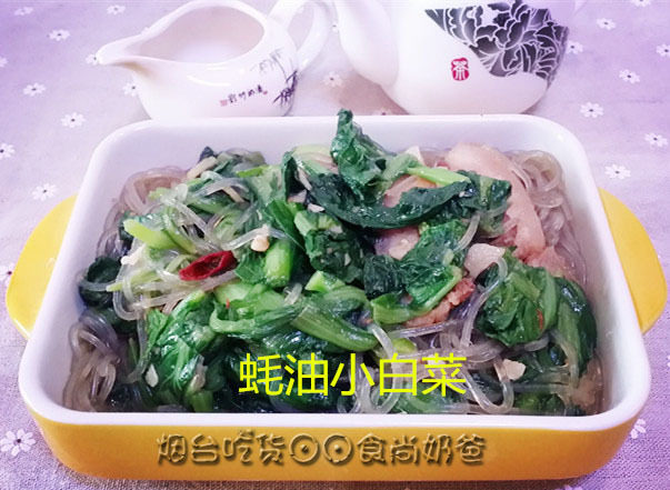 4: 油锅烧热加五花肉煸炒出多余油脂,蒜末、姜丝、干辣椒爆香入小白菜煸炒后加入粉条,放蚝油、糖、盐调味点香油出锅