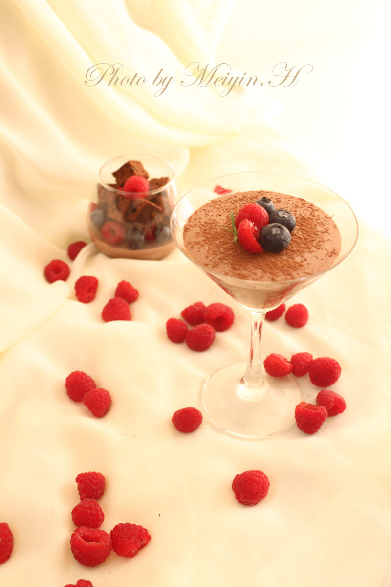 7:慕斯液倒入容器至九分满,放入冰箱冷藏4小时至凝固即可食用。装饰:将配料里的可可粉筛在已经凝固的慕斯表面,再放上篮莓和红树莓即可。