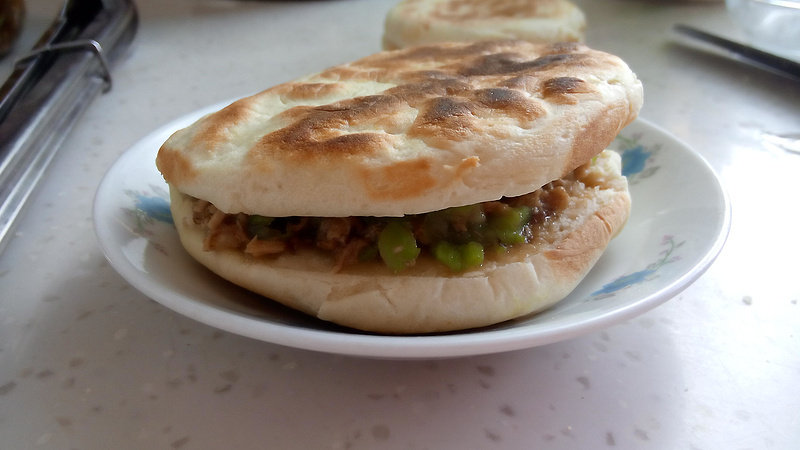 17:用刀剖开饼子,最后连着一点,不要全部切断,放进做好的肉馅,并浇上一点卤汁,