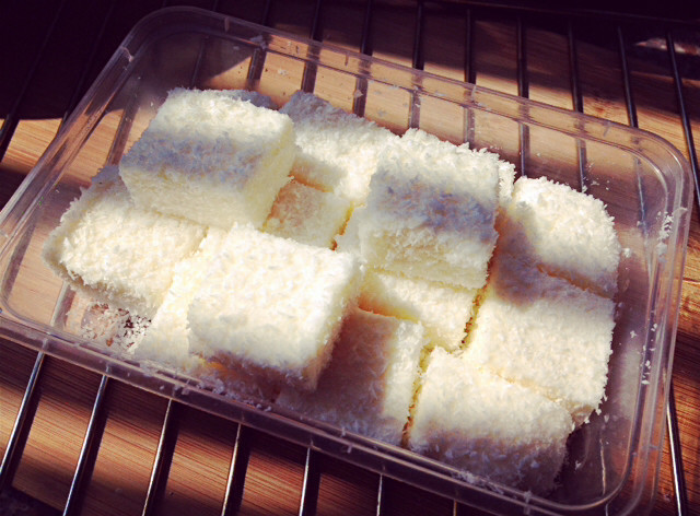 9:倒扣在另外一保险盒里,脱下用小刀切成小块,再裹上椰蓉