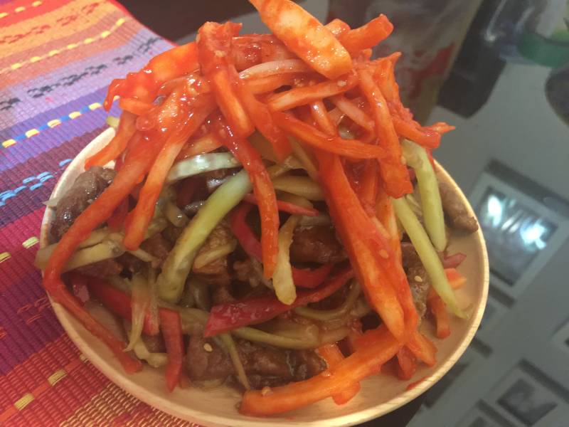 7:把黄瓜丝,肉丝放进碗搅拌,放进摆盘后,最后撒上桔梗。真的很好吃,我就是拍的不好看,焦急。