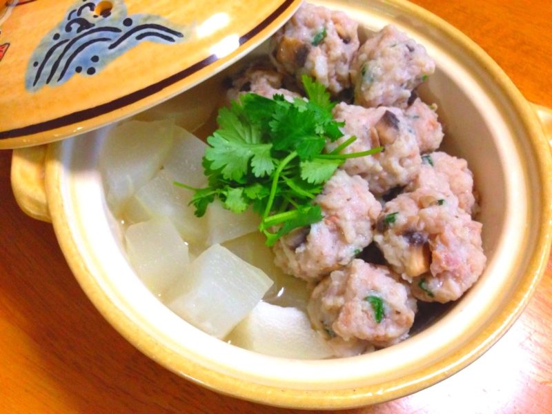 7:烧开水下冬瓜,大概10分钟冬瓜熟透。同时,将丸子一个个捏好放一边。