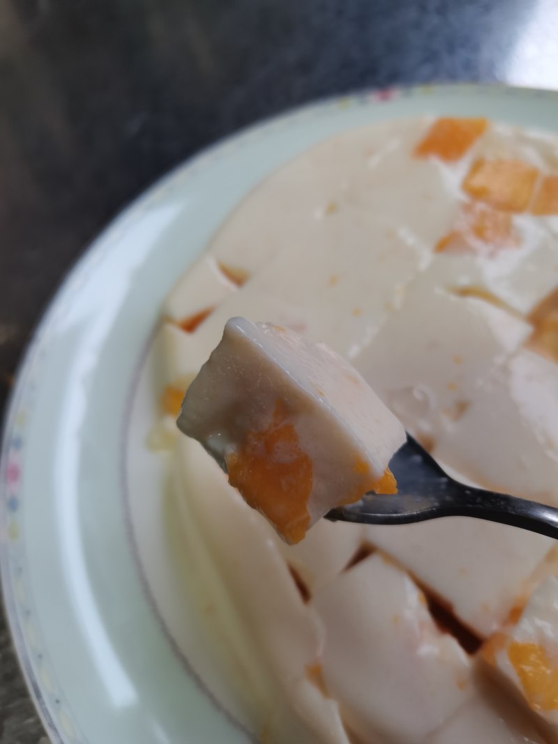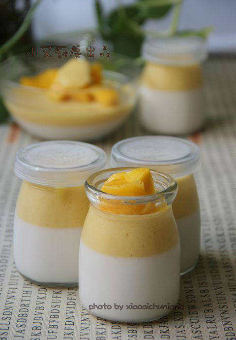 4:凝固的牛奶冻上加上切好的芒果丁。