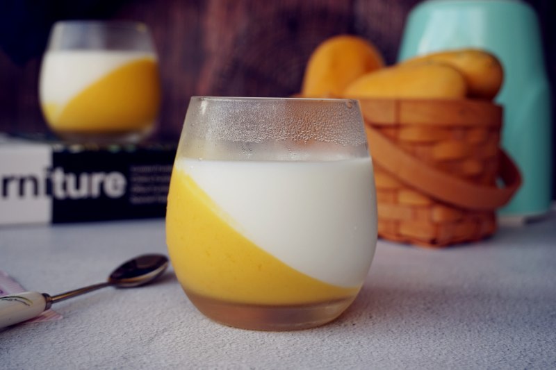 8:将牛奶液倒入已经凝固的芒果液中,放冰箱冷藏凝固即可。