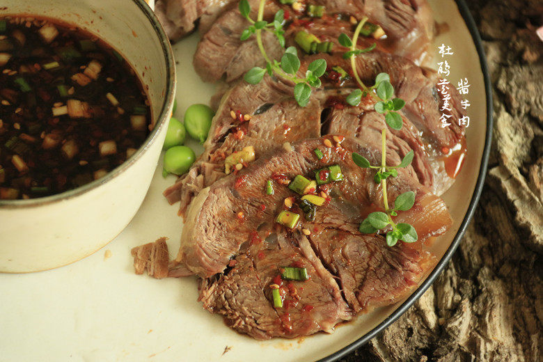 11:少许姜丝、2根香葱碎、2勺陈醋、4勺生抽、1勺香油、1勺辣椒油调一碗料汁,用酱牛肉蘸着料汁吃味道更足哦!卤完牛肉的汤还可以继续卤其它你自己爱吃的菜哦!