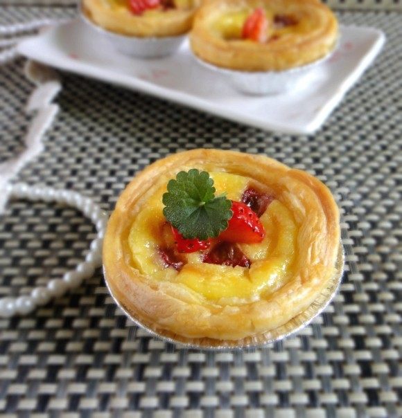 7:好看又好吃的草莓蛋挞出炉,在蛋挞上撒上草莓小粒,香甜嫩滑,保你吃了还想吃。