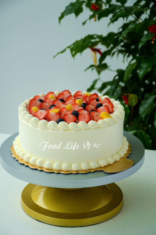 戚风(6寸):鸡蛋3个;低粉35克;玉米淀粉5克;牛奶20克;玉米油20克;细砂糖24克;柠檬汁几滴;夹心:芒果适量;草莓适量;奶冻适量;装饰:淡奶油300克;蓝莓少许;芒果少许;
