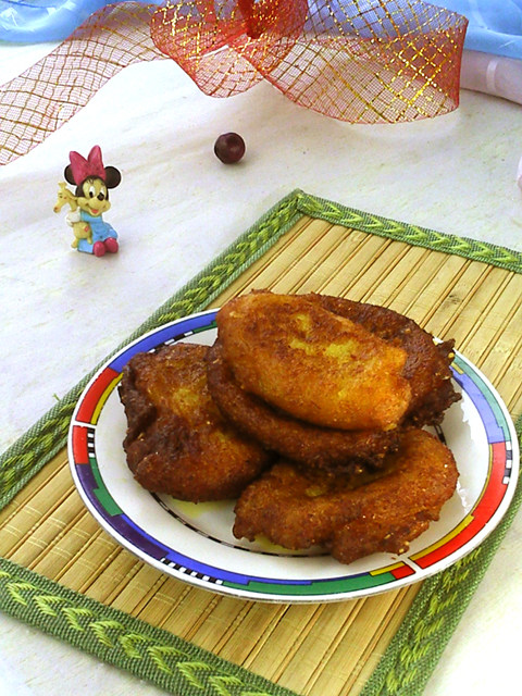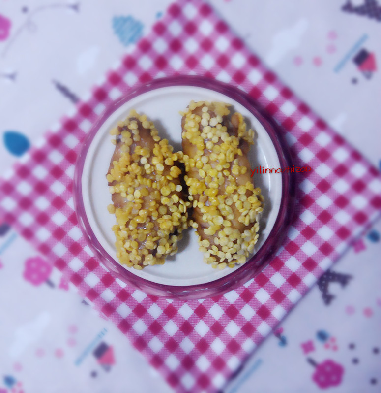 8:将油见开,放入裹好面包糠的香蕉片炸
