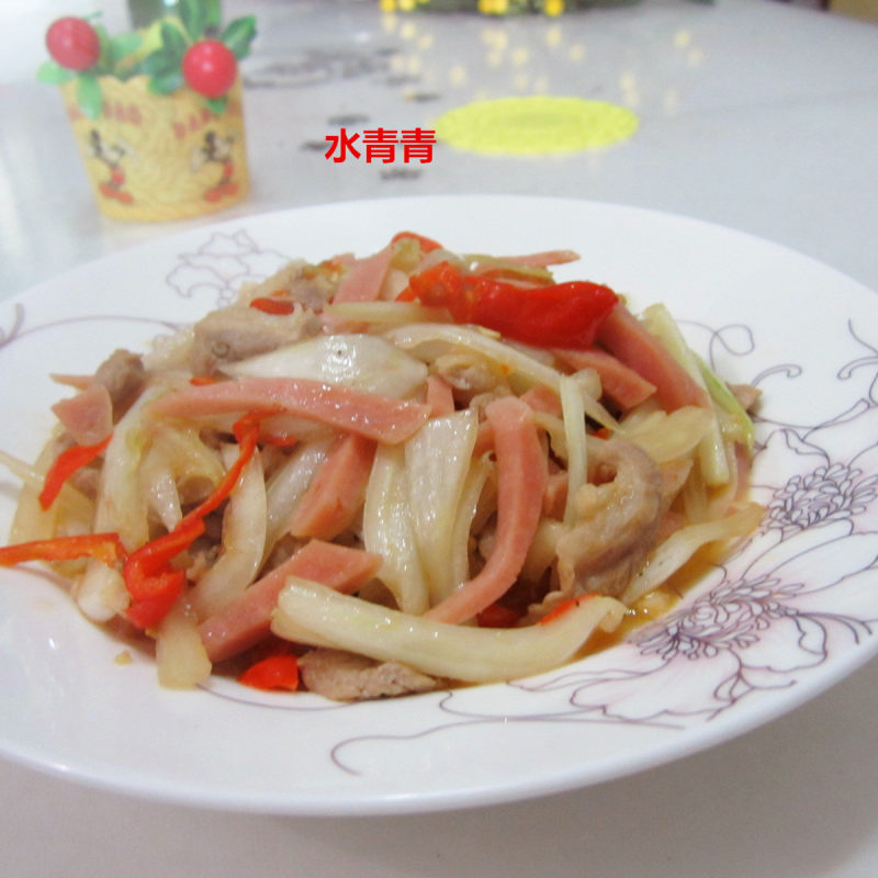1:备白菜丝,肉丝,辣椒丝,火腿丝。