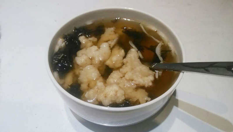 4:拿一个勺子,往水开了的锅子里刮肉泥,差不多一小口大小就好,等开了,看看熟了,就可以起锅啦,把肉丸过滤掉水分,打到碗里