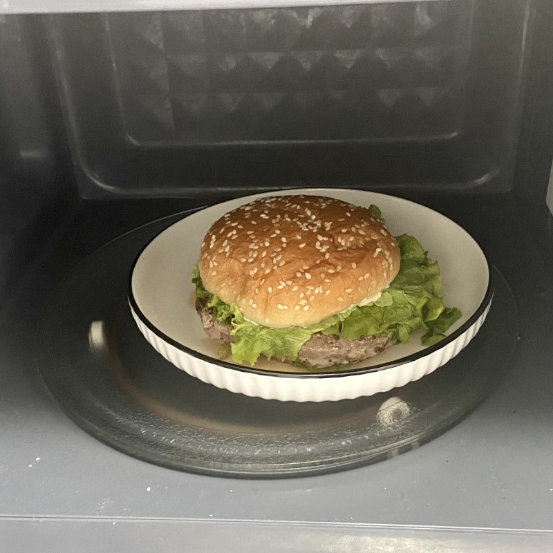 6:组合好的汉堡放到微波炉中火加热2分钟即可食用。