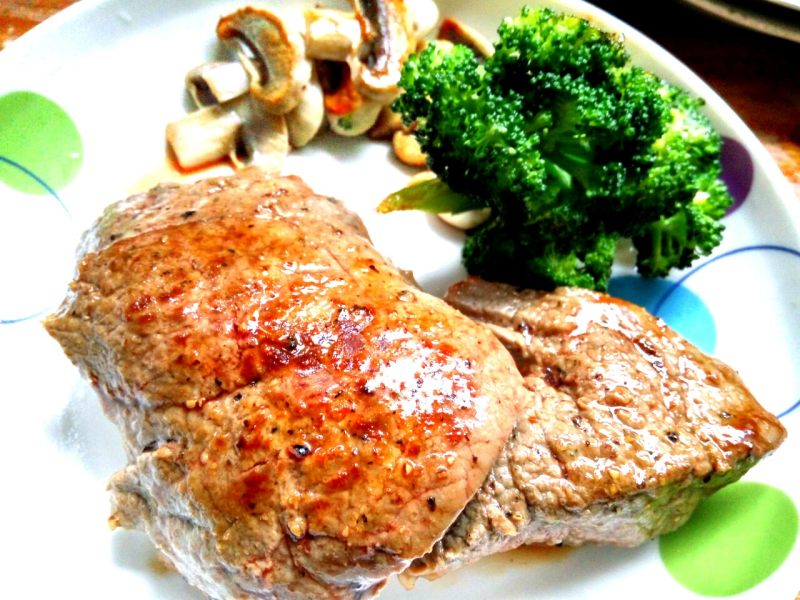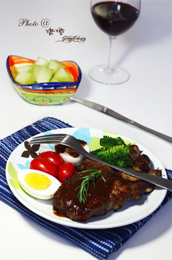 8:烤箱中的牛排要勤快地翻面,以免烤糊。牛排烤好后,放上配菜摆盘。食用前淋上A1酱即可。