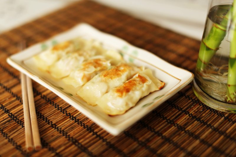 7:包好的饺子放平底锅中火煎一分钟,不能太拥挤,不能重叠。不要翻面,倒上热水,水高大概到饺子高度的一半。盖盖子,中火煮到水分差不多蒸发干,开盖,翻面续煎1-2分钟直到另一边也透金黄色
