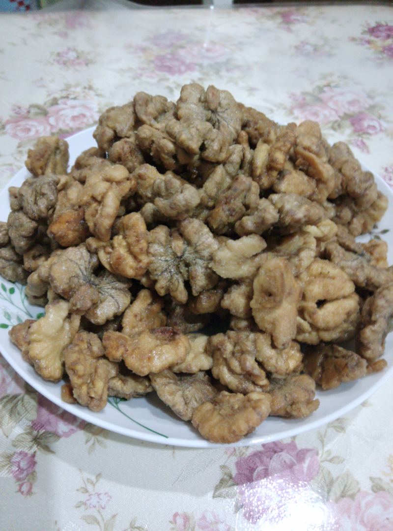 3:在锅中倒入500克色拉油烧热,将蘸好糖的核桃仁倒入油中,油炸三分钟左右,注意火不要太大,核桃仁稍一变色即可,注意不要炸糊,个人经验边炸边尝,9成熟即可,捞出后表面的油还是很烫,凉了刚刚好,要是炸至刚好,实际上就已经火大了。