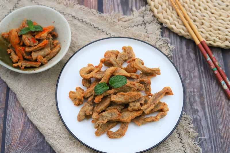 8:炒锅内加宽油,烧至七成热时加入腌制好的肉条,炸至金黄色,捞出。