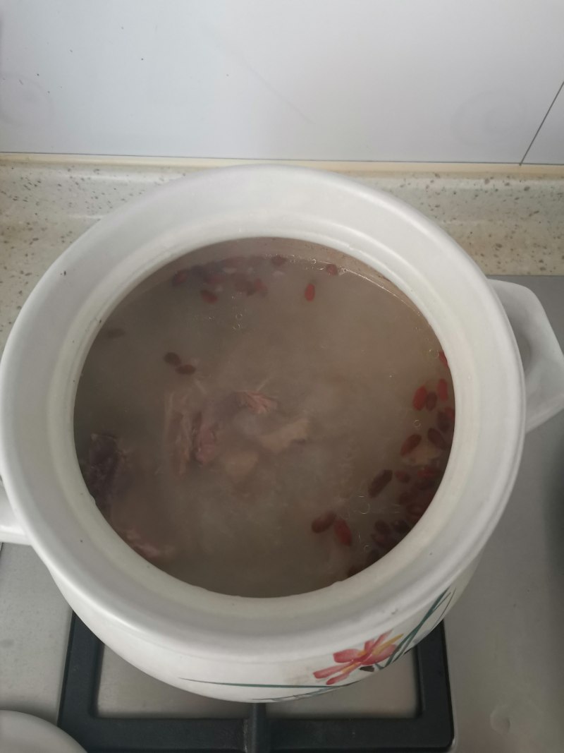 11:一个小时后,加入山药和枸杞,泡山药的水也一起加进去,水开后继续炖半小时左右。