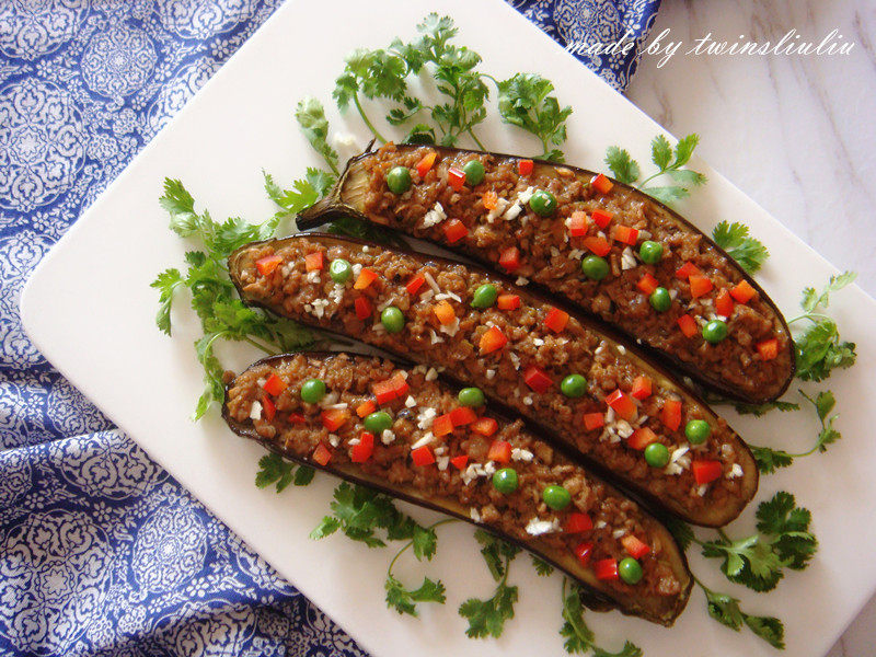 15:茄子经过第一次烤制出炉,将炒好的肉馅酿在茄子上,再次入烤箱160度5分钟出炉。