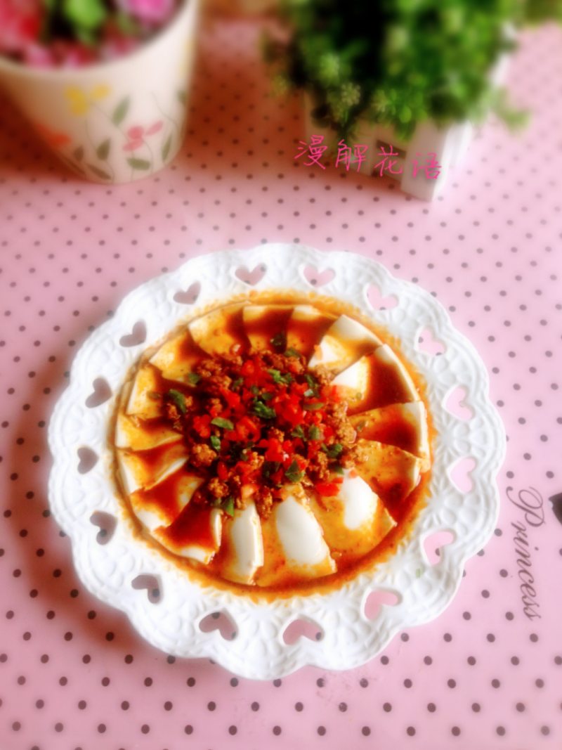 豆腐要用嫩豆腐,在翻动的时候不能太用力,容易碎,影响美观,不喜欢太辣的也可以少放点辣椒,可以根据个人喜好添加