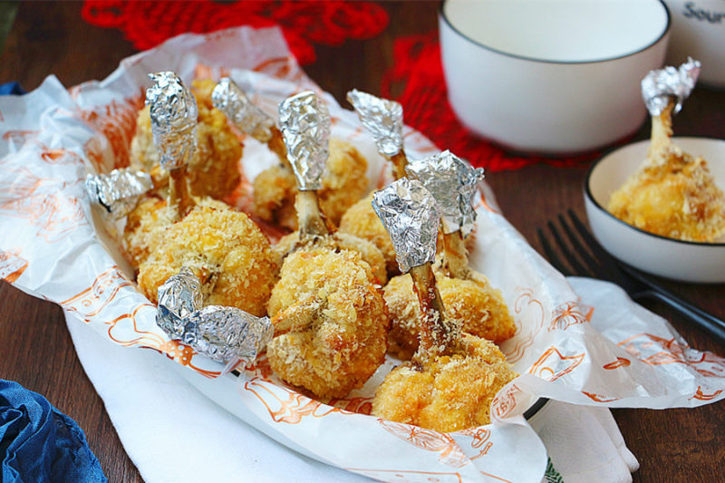 7:锅中多放些油,油烧热后下入裹好粉的鸡腿,高温定型转中小火炸熟即可