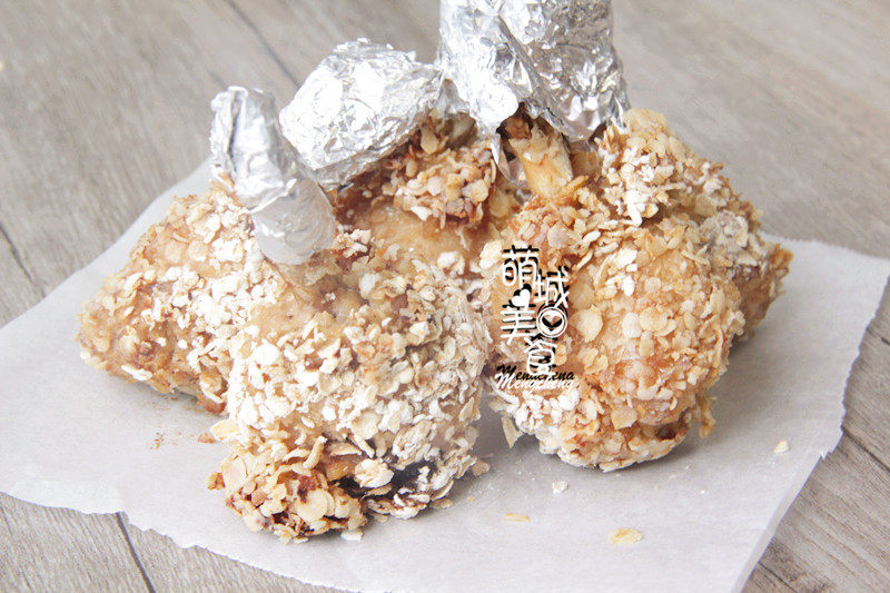 4:从冰箱取出腌制好的鸡翅根,裹上燕麦片,放在垫有锡纸的烤盘上