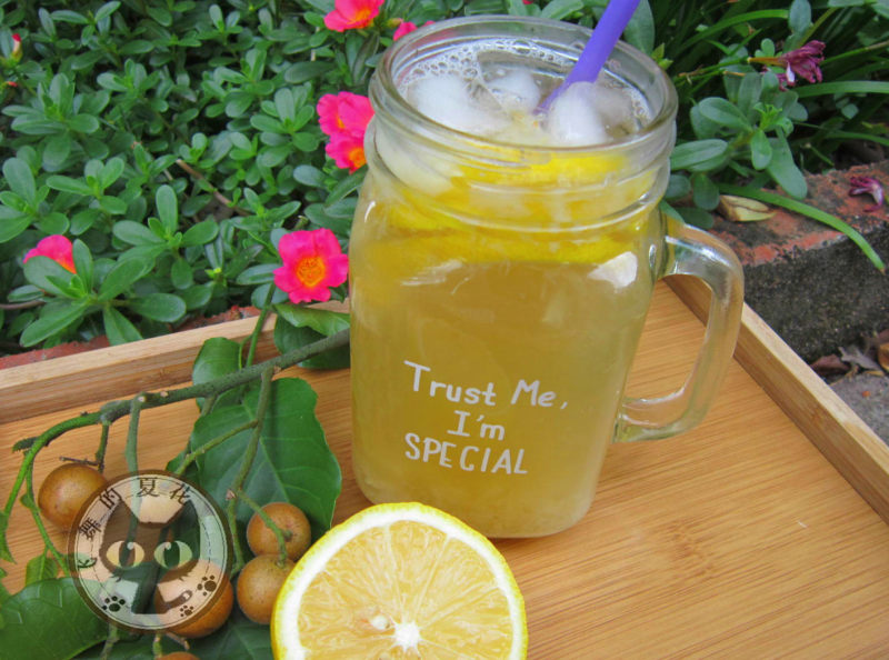 5:放入柠檬片与黄皮果肉一起捣汁,接着加入糖浆,倒入300ml茉莉绿茶,搅拌均匀。