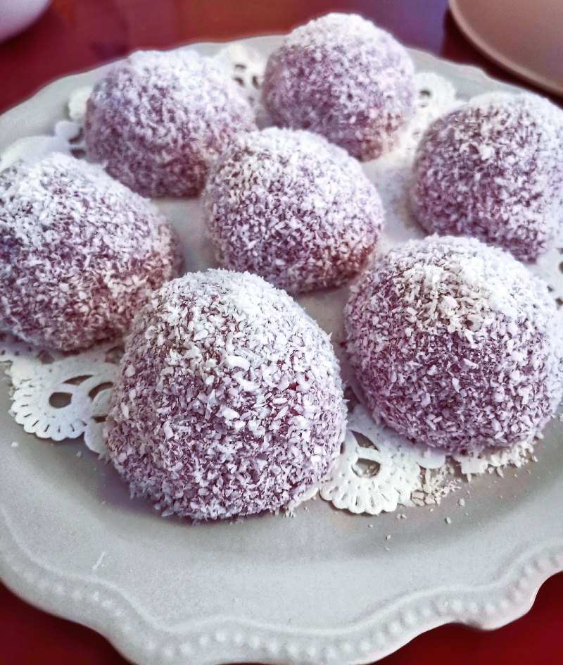 8:出国后将糯米糍趁热裹上一层椰蓉,然后放入小纸杯中或者盘中~
