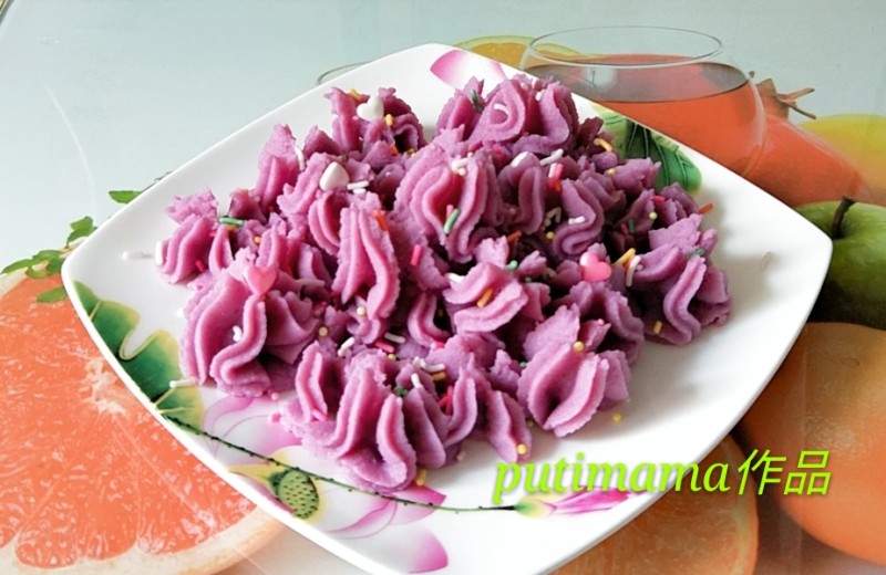 5:将紫色山药泥装入裱花袋中,挤出山药泥,再撒入糖针点缀即可。紫色山药细腻、颜色漂亮、营养丰富。